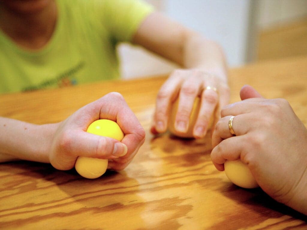Vi värmer upp med ett paraffinbad och använder sedan bollar och lera med olika motstånd som redskap